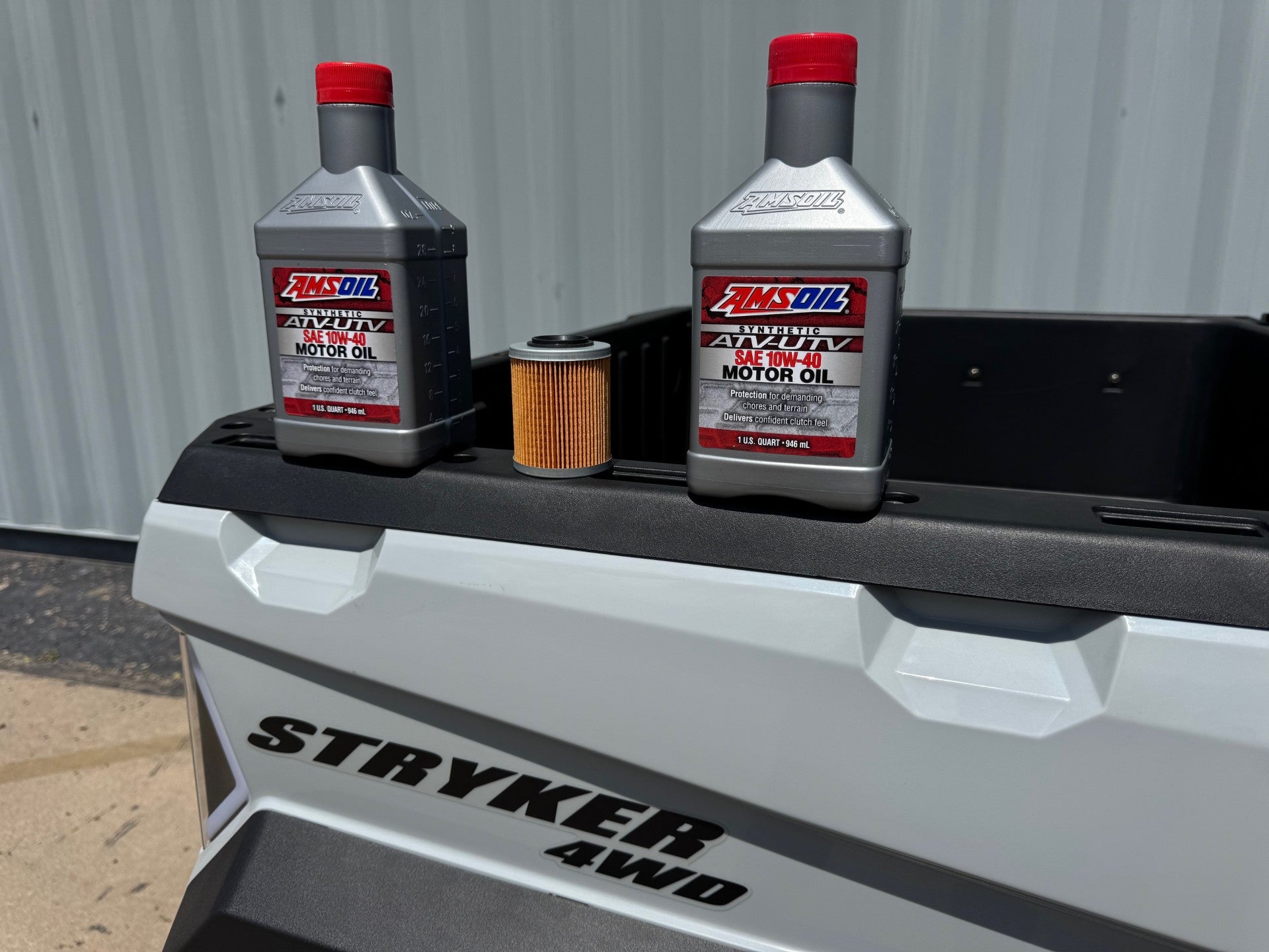 What is in the box: 2 quarts of AMS Oil UTV 10W40 Full Synthetic Oil and 1 Hisun factory oil filter (cartridge style).